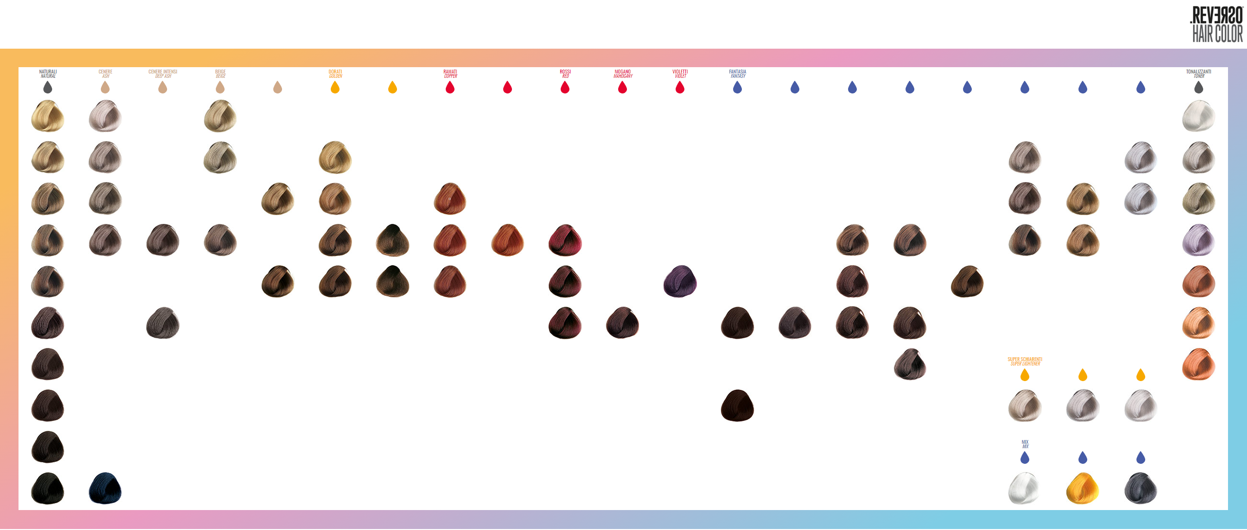 Les nuances REVERSO doivent être utilisées en mélange avec les émulsions oxydantes REVERSO OXY 10-20-30-40 Vol. pour obtenir des couleurs permanentes et avec le REVEALER 5 Vol. pour obtenir des couleurs semi-permanentes.