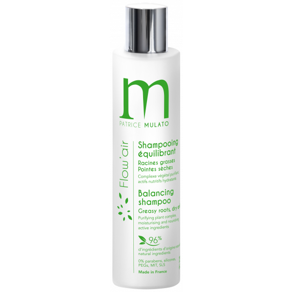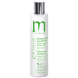 Le shampooing équilibrant Flow’air de Patrice Mulato lave en douceur, purifie le cuir chevelu, régule la sécrétion de sébum, hydrate, nourrit les longueurs sensibilisées et favorise le démêlage.