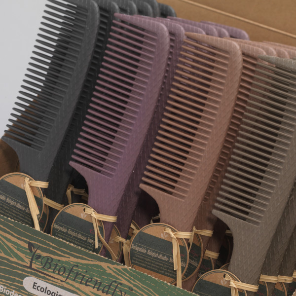 Ce peigne écologique est fabriqué à partir de matériaux biodégradables; une sorte de biopolymère composée de fibres de paille et résine. Ce qui permet de réduire considérablement les émissions de CO2 durant la fabrication.